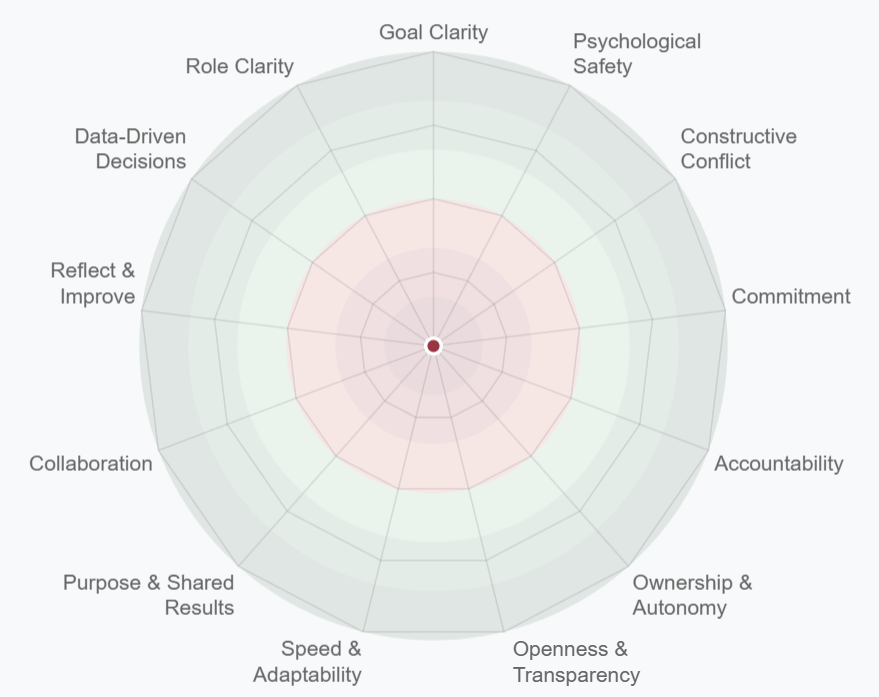 To generate the score, each team member answers a brief, confidential assessment that probes deeply into the main dimensions that shape your team's day-to-day reality. By asking each team member for their candid, unique perspective, the assessment uncovers what is working, what obstacles might be present, and where there are opportunities for meaningful improvement. The result is a set of qualitative yet comprehensive insights that give the team leader a clear view of dynamics and actionable areas for growth.